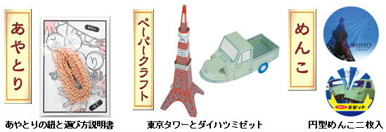 21日公開の映画「ALWAYS 三丁目の夕日'64」とのタイアップ商品で、映画の舞台である1960年代に流行していたおもちゃ(めんこ、あやとり、ペーパークラフトのいずれか)が1つ付いてくる。