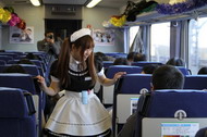 各車両には1人ずつメイドさんが乗車しており、先ほども書いたように、順番にご挨拶して話しかけてくれる。もちろんわたしのところにもいらっしゃったのだが、20歳以上も離れている(だろう)メイドさんなどと、どうやって話していいのかよく分からない。うわ、近づいてくるよ……。