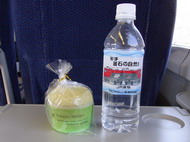 これもなぜか“富良野の”メロンパン。メロンクリームが入っていておいしかった。右にあるミネラルウォーターは、ウェルカムドリンクとして配られたもの。お茶とミネラルウォーターが選べたのだが、ここはやっぱり「岩手 釜石の自然水」を選択した