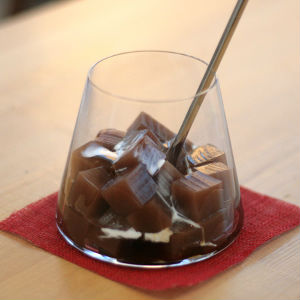 カカオ粉末をところてんに配合してサイコロ状にカットし、添付の珈琲味の蜜とフレッシュミルクをかけて食べる。