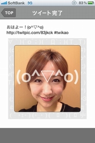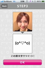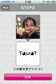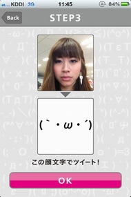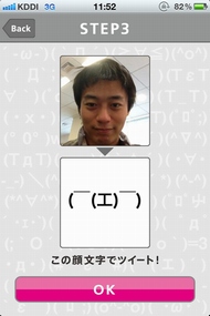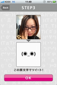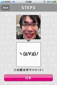 顔を線に合わせたら撮影ボタンを押して撮影。次に確認画面が出るので、OKボタンを押せば表情の解析が行われる。解析は少し時間がかかるときもあるが、10秒ほどで顔文字が表示される。表示された顔文字は、好きなコメントを付けてツイートできる。顔写真と顔文字を一緒に投稿することも可能だ(顔写真の上に顔文字が重なった画像がTwitPicに投稿される)。