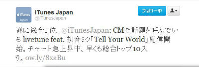 Google Chromeのプロモーション動画で流れているlivetune feat. 初音ミク「Tell Your World」が、iTuness Storeで総合1位に。