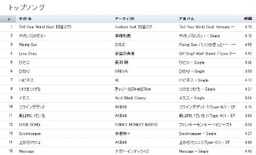 livetune feat. 初音ミクによるCMソング「Tell Your World」(200円)は1月18日に配信が始まり、間もなく総合チャートでトップ10入り。翌19日には総合1位を獲得した。2位は斉藤和義の「やさしくなりたい」、3位はEXILEの「Rising Sun」だ。