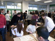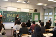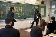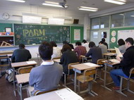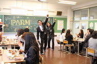 パーティは「4時間目の授業」から。“先生”が登場して日直の「起立! 礼!」。そのあと先生が参加者の名前を呼び、出席を取ることから始まった。