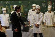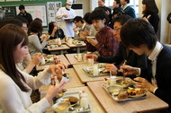 北澤さんの紹介が終わったところで待望の給食タイムに。配膳(はいぜん)前に机を動かして5〜6名の班を作るところまでこだわっている。そして班を作り終わったら、いよいよ待望の給食タイム。ちなみに給食当番(料理担当)は、2カ月先まで予約が埋まっているという「フレンチレストラン オギノ」のオーナーシェフ、荻野伸也さんだ。