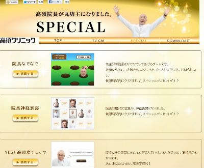 このスペシャルサイト、高須院長が出家して丸坊主になったことを受けてできたもので、丸坊主の院長がフィーチャーされている。ゲームコーナーには、モグラたたきの要領で院長の頭をなでるゲーム「院長なでなで」や、カードを当てるたびに「Yes!」と聞こえる「院長神経衰弱」、「YES! 高須度チェック」が用意されている。