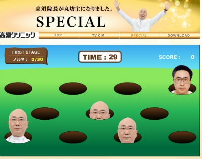 高須クリニックのスペシャルサイトで丸坊主の高須院長をフィーチャーしたゲームが提供されている。