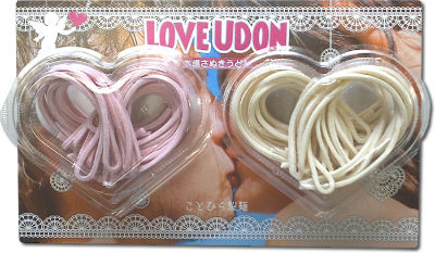ハート型の透明なプラスチックケースに、ピンクとホワイトのうどん麺を80グラムずつ入れた。ケースの台紙には男女がキスをしている写真をあしらっている。麺は国産小麦100%、低温熟成14時間の半生うどんで、愛の大盛つゆ付仕様という。ネットショップなどで販売する。