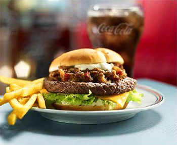 通常のビーフパティの約2.5倍のパティ、スパイシーに味付けしたスライスビーフとオニオン、クリームチーズソースをはさんだ。「ラスベガスのきらびやかさ、豪華さ」を表現したという。