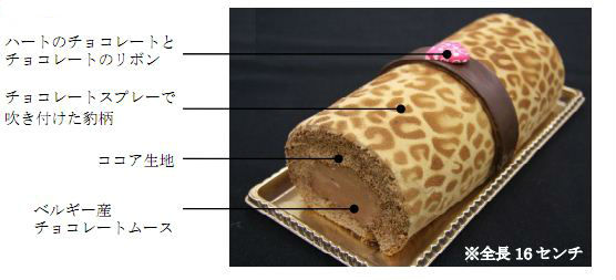 ココアロール生地でベルギー産チョコレートムースを包み、チョコスプレーでヒョウ柄の模様を吹き付けた。チョコレートのリボンを巻き、ハート形チョコレートを飾っている。