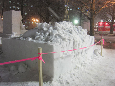 2月9日追記: 雪像の倒壊でけがをした女性は、腰の骨にヒビが入っており入院中。新たな雪ミク雪像は8日夜の時点で、ブロックを積んで寝かせている段階だった。