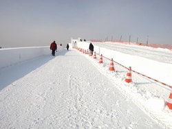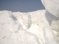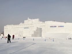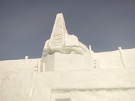 比較するものがないと大きさが分からないので、筆者が顔の横に立ってみた。米粒のような筆者の大きさから、雪像がいかに大きいかが分かるはず