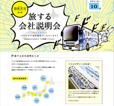 「たった1回の説明会に出るために、多くのお金と時間を費やすのはもったいない」ということで、鎌倉本社に来てもらう代わりに、カヤックの方からバスで全国各地に出向く。2月28日から3月5日まで、全国17都道府県で実施する。