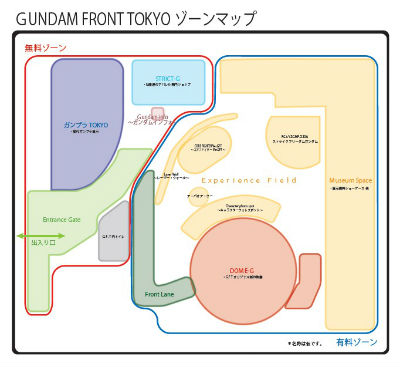 オープンは4月19日。複合施設「ダイバーシティ東京 プラザ」7階に入る。エントランスには地球軌道上に漂うガンダムの幅17メートルの巨大アートが飾られる。映像体験ゾーンでは、直径16メートル、6台のプロジェクターと13台のスピーカーを設置したドーム「DONME-G」で、実物大ガンダム立像をモチーフにした映像や、ガンダム作品の名場面に加え、新作フルCGのモビルスーツバトル映像などを上映する。