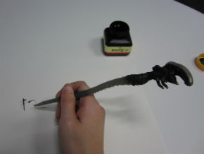 羽ペンみたいにエイリアンチョップスティックで字を書いたらカッコイイんじゃないだろうか。そう思って試してみたが、墨汁ののりが悪くてうまく書けなかった……残念。