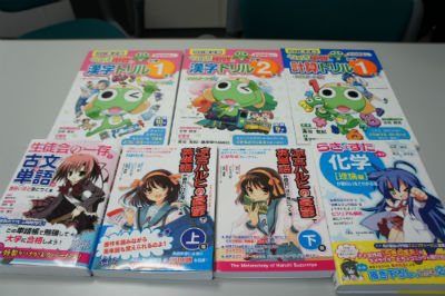 会議室に入るなり視界に飛び込んできたのは、数々の人気アニメキャラたち。「『ケロロ軍曹』の漢字ドリルシリーズ」に「計算ドリル」、「『生徒会の一存』で古文単語が面白いほど身につく本」、「『涼宮ハルヒの憂鬱』で英単語が面白いほど身につく本」シリーズ、「『らき☆すた』と学ぶ 化学[理論編]が面白いほどわかる本」が並ぶ。これらは、同社の親会社である角川グループホールディングスとのコラボレーション商品だ。