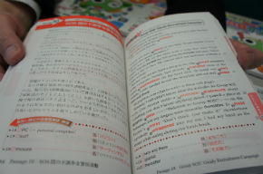 気になるのは中身だが、「『涼宮ハルヒの憂鬱』で英単語が面白いほど身につく本」では、左側のページに『涼宮ハルヒの憂鬱』のワンシーンをそのまま抜粋したものが、右側のページにネイティブスピーカーが英訳した文章が載っている。重要な単語は赤い文字になっており、懐かしの赤色チェックシートで隠すことができる。よく海外ドラマを観て英語を覚えるという人がいるが、その感覚に近いのかもしれない。内容は学校のカリキュラムに沿った、学習効果のある参考書として作られているという。