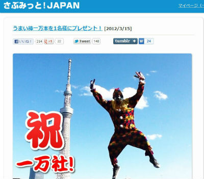 ITベンチャーのさぶみっと!JAPANが、自社のマッチングサイトの登録会社が1万社を突破した記念に、うまい棒1万本をプレゼントするキャンペーンを始めた。ただし、1万本全部を1人だけにプレゼントする。