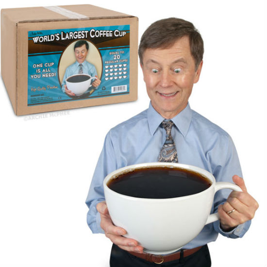 「World's Largest Coffee Cup」(世界最大のコーヒーカップ)という名のこの商品、陶器製で直径10インチ(25センチ)で高さは6インチ(15センチ)。普通のカップ20杯分のコーヒーが入ります。両手でしっかり支えないと持てないサイズです。