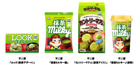 4月3日に「抹茶ミルキー袋」、「ルック(抹茶デザート)」、「カントリーマアム(抹茶アイス)」を、9日に「抹茶ミルキー」を発売する。