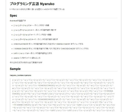 プログラミングNyarukoは「(」・ω・)」うー(/・ω・)/にゃー」や「CHAOS☆CHAOS!」を使ってコードを書く。「(」・ω・)」うー(/・ω・)/にゃー」でポインタを右へ移動し、「(」・ω・)」うー!(/・ω・)/にゃー!」でポインタの指す値を1増やす、といった仕様になっている。