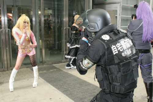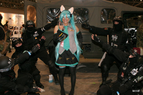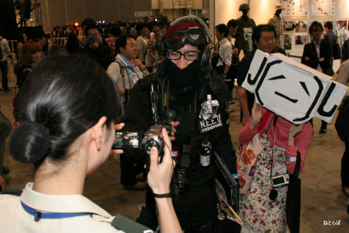 「自宅警備隊 N.E.E.T」は陸自ブースに乗り込んだり、エヴァと戦ったりと大活躍(?)。「MOCO'sキッチン」のオリーブオイルという誰得すぎるコスプレも。