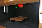 黒い部屋は利用者ではなく、co-ba運営者側からの発信に使われる。壁には本を立てて入れる縦長い隙間があり、21冊の本が置ける。ここに並べられるのは長年に渡って読み続けられてきた、歴史的名著が中心。置く本のテーマを設定して、ブックセレクターとコラボしていく試みもあるという。本は1週間ごとなど定期的に入れ替わる。かなり明かりを落とした部屋なので、瞑想や考えごとに使うこともできそう。赤いシャンデリアがゴージャスだ。