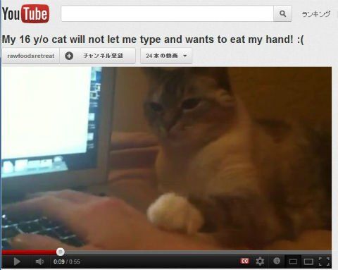 動画の中で、ネコのPyeはPCのキーボードを使おうとする飼い主の手を「使っちゃダメ」と言わんばかりに何度も押しのけて、ついには飼い主の手をカプッとかんでしまいます。飼い主によると、彼女がPyeに構わずにキーボードをたたこうとすると、いつも噛み付いてくるのだとか。