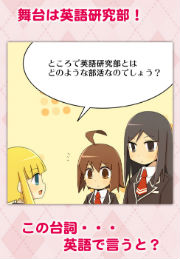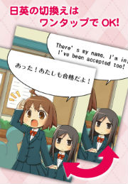 英語が苦手な女子高生が英語研究部を立ち上げたというストーリーの4コママンガを収録。登場キャラには人気声優の沢城みゆきさん、小林未沙さん、加藤優里さんが声を当てている。4コママンガは日本語版と英語版を切り替えて読める。英語力向上のための解説とクイズもついている。