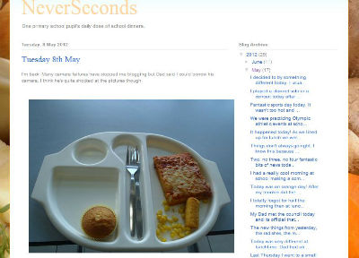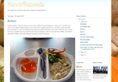 マーサさんは4月末に、父親の助けを借りてブログ「NeverSeconds」を立ち上げ、通っている学校の給食の写真を点数やコメント付きでアップした。貧しい子供のためのチャリティーに寄付を募るために立ち上げたブログだったが、給食が貧相なことが話題になり、ニュースに取り上げられるようにもなった。例えば彼女が最初に投稿した給食の写真は、ピザ1切れに小さなカップケーキ1つと小さなコロッケ1つ、コーンが少々という内容だった。