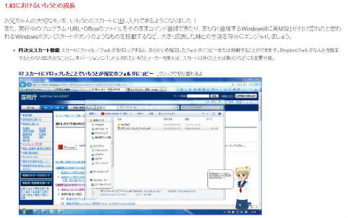 ほかにもファイル・フォルダのドロップでコマンドが実行できる「いもうとドロップ」機能も追加された。デフォルトでは顔にドロップするとメモ帳、スカートは四次元スカートとなっていて、エリアとコマンドの紐付けはいもうとメーカーで設定できる。