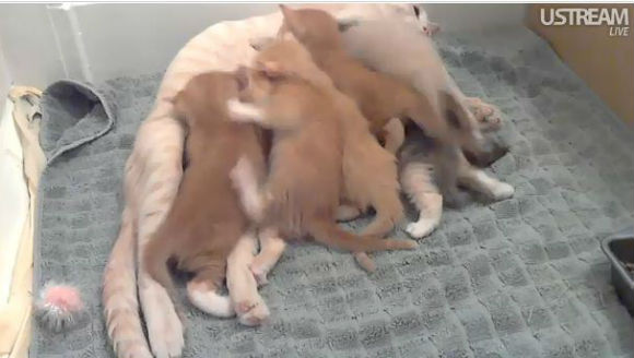 Ustreamチャンネル「sevenkittens」はアメリカのピッツバーグに住むユーザーが運営している。6月にNoodlesという名前のネコから生まれた7匹の子ネコを配信している。子ネコたちがぐっすり眠ったり、おもちゃで遊んだり、母ネコの乳を吸ったりする様子が流れており、いつまでも眺めていたくなる。