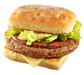 「ル・グラン」(フランス)、「ゴールドマサラ」(インド)、「オージーデリ」(オーストラリア)の3商品を提供。最初に登場するル・グランはもちもちした食感の「チャバタ」パンに、4分の1ポンドのビーフパティ、レタス、モツァレラチーズをサンドした。トマト入りでバターソースの「ル・グラン トマト」(単品390円)と、ポークソーセージ入りでマスタードレリッシュソースの「ル・グラン ソーセージ」(単品410〜420円)がある。