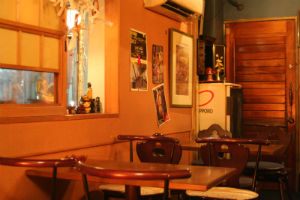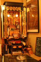 扉を開けてみると、落ち着いた照明の店内が視界に広がる。カウンター席とテーブル席があり、テーブル席の一部は畳に腰掛けることができる。お坊さんが経営するバーだけあって、和のテイストで統一されている。お賽銭箱や仏壇、曼荼羅や仏教に関するグッズなどが置かれているのもポイント。店内の奥にある仏壇では、営業開始前や営業中にお坊さんがお経をあげている。