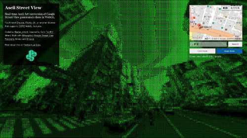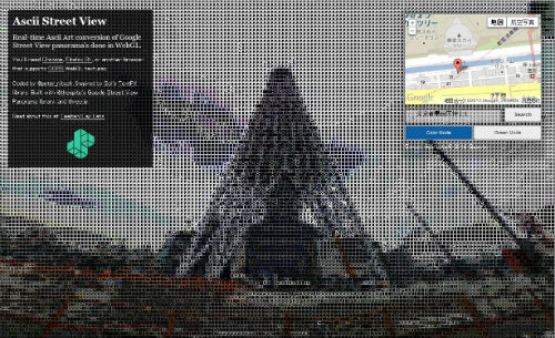 Googleストリートビューをアスキーアート化して見ることのできる「Ascii Street View」が話題になっています。WebGLを使用し、リアルタイムに画像処理を行っているようです。Webブラウザによっては上手く表示されない可能性があるため、Google ChromeやFirefox 8以降などが推奨されています。