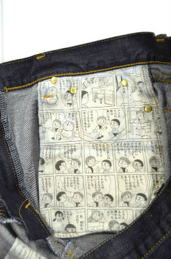 後ポケットにはタケコプターのプリント入り。裾や内ポケットはコミック柄だ。
