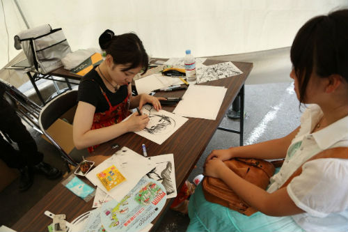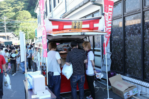セレモニーの後は、ニコニコ動画で活躍するぶいらさんとDa-littleさんによる会場の見学パート。ニコニコカー神社やゲーム実況ブース、似顔絵ブース、たこ焼きに射的などニコニコ動画らしい味付けがなされた企画・露店の数々が中継され、現地の盛り上がりがニコニコ生放送を通じて全国へと届けられた。