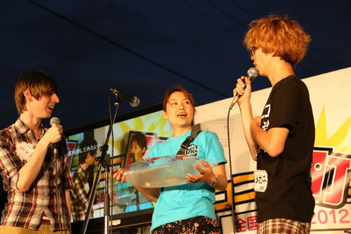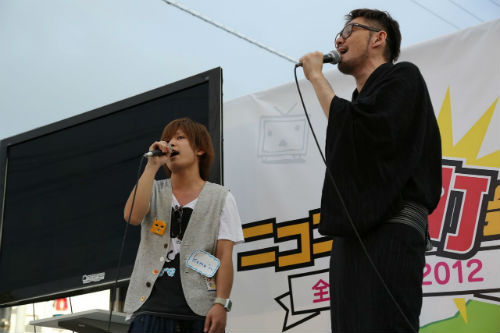 その後は、地元のニコニコ動画ユーザーが参加しての「のど自慢」コーナーへ。アニメソングやボカロ曲など、ニコニコ動画で人気の楽曲で会場が温まったところで、歌い手のDa-littleさん、koma'nさんがステージに登場。Da-littleさんはバラードを中心に「月のワルツ」「rain stops good-bye」「glow」の3曲を、koma'nさんは逆にアップテンポなナンバーを中心とした「二息歩行」「from Y to Y」「Bad Bye」の3曲を披露し、大歓声を浴びていた。