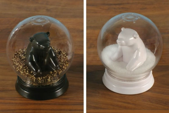 スノードームのような透明の球形の容器が2つセットになっていて、片方には白いクマ、もう片方には黒いクマが入っています。白クマのほうには塩を、黒クマのほうにはこしょうを入れると色もぴったり。もちろん振ると塩・こしょうが出てくるように容器の上には小さな穴が開いています。ドームの部分を回せば開けられるので、詰め替えも簡単です。