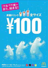 日本マクドナルドは8月17日から、「炭酸ドリンクALLサイズ100円」キャンペーンを9月上旬までの期間限定で実施する。