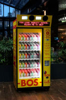 この自販機「BEV」は同国の飲料メーカーBOSが、紅茶飲料「BOS Ice Tea」の宣伝のために作ったもの。携帯端末を持ってBEVの前に立って、「@bos」アカウントあてにハッシュタグ「#BOSTWEET4T」を付けてTwitterでつぶやくと、紅茶のサンプルが出てきます。位置情報技術を使ってユーザーの位置を把握し、Twitter APIを活用しています。