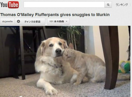 ネコのThomas O'Malley Flufferpantsが、モフモフな犬Murkinに顔をスリスリしたり、Murkinの足に頭を載せたりと甘えています。Murkinはどーんと構えてそれを受け止めていて、見ているとほっこりした気分になります。