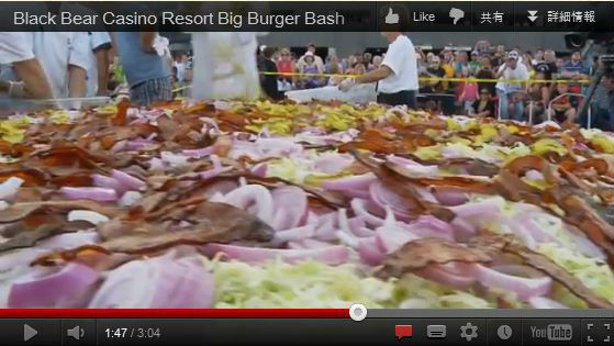巨大バーガーを作ったのは、米ミネソタ州のリゾート施設Black Bear Casino Resort。直径10フィート(約3メートル)、2014ポンド(約914キロ)のベーコンチーズバーガーだ。これまでの世界記録881ポンドの2倍以上の大きさだ。ベーコン60ポンド(27キロ)、レタス50ポンド(23キロ)、スライスオニオン50ポンド、ピクルス40ポンド(18キロ)、チーズ40ポンド以上を使ったという。