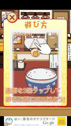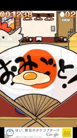 ゲームのルールは、たまごを1回タップするとヒビが入り、さらにタップすると殻がパカッと開き、3回目のタップでご飯の上に落ちていきます。コン、コン、パカッ! コン、コン、パカッ! のタイミングです。ご飯は台の上を次から次へと流れていくのでタイミングを見極めて卵を割っていきましょう!