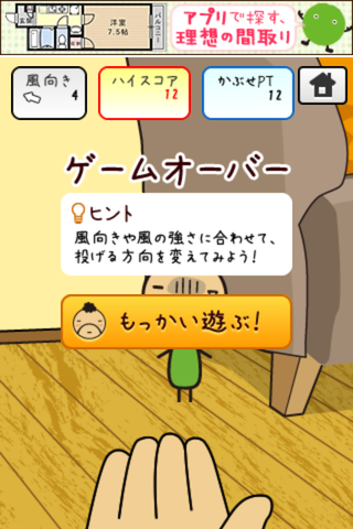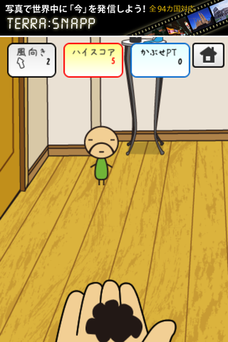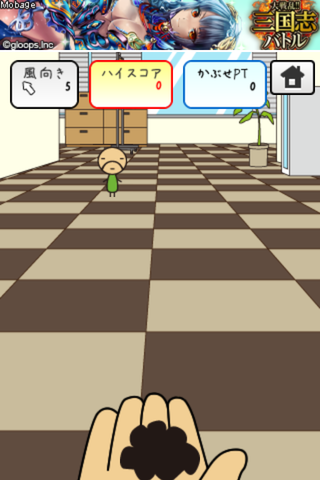 画面左上部に「風向き」と表示されるので風の向きを考えながら手のひらの上のかつらをちっちゃいおっさん目がけてスワイプしていきましょう!