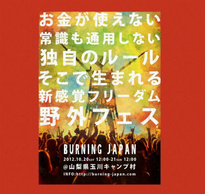 BURNING JAPANはこうしたBurning Manの世界を日本でも広めることを目指したイベント。「世界レベルで有名な、超ファンキー&フリーダムな祭りに影響を受けた『日本一ファンキー&フリーダムな祭り』の第0回」としている。会場は山梨県の玉川キャンプ村で、チケットは前売り5000円、当日券7000円。Burning Japan運営事務局が主催する。