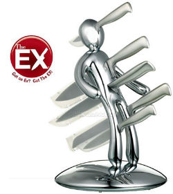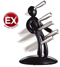人形型のプラスチックのホルダーにスリーブがついていて、ナイフを差して固定するようになっています。シェフナイフ、パン切りナイフ、肉切りナイフ、万能ナイフ、ペティナイフの5本がセット。すべてのナイフをしまったところは、体中をナイフで刺されたようで呪いの人形のよう。名前に「VOODOO(ヴードゥー)」が入っているだけあります。何も知らない人が見たらぎょっとするかも?