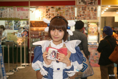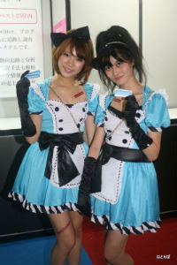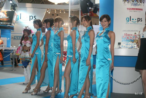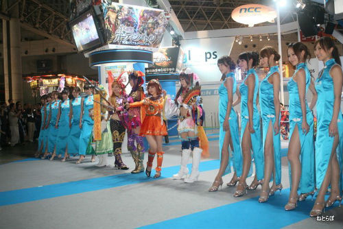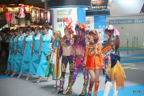 gloopsなどのソーシャルゲームのブースは、資金力を反映してか衣装も豪華だ。特に閉会間近になるとコンパニオンが集合して撮影大会になるが、gloopsのドレスはストロボを反射する素材で作られており、会場が一層きらびやかになった