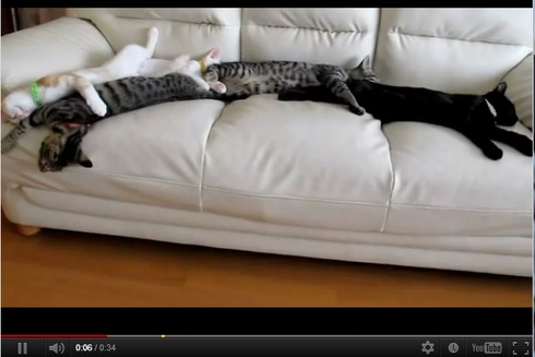 広々としたソファの上で目一杯体を伸ばして寝ているネコちゃんたち……ってすごい繋がってるー! 5匹のネコがそれぞれ足を持ったりお尻に顔を埋めたりして綺麗な曲線を描いています。左端には抱き合うようにして寝ているネコもいてとってもキュート。こちらまで眠たくなってきてしまうほのぼの動画でした。