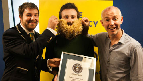 ギネス認定されたのはアイルランドのEd Cahillさん(25)。約1年かけてのばしたひげに、3時間弱の時間をかけて3107本のつまようじを差しました。ギネス認定人立ち会いのもと、地元のラジオ局でチャレンジを行いました。びっしりとひげにつまようじがささった姿は、まるで木のひげが生えているよう。